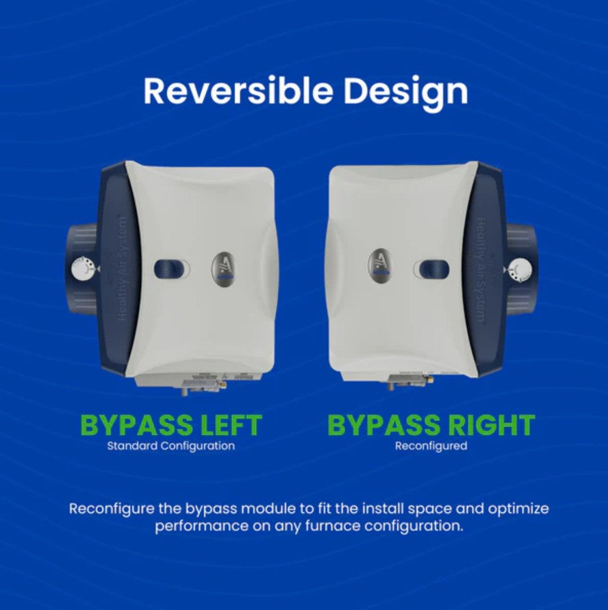 • REVERSIBLE DESIGN – The bypass module can be reconfigured to fit tight installs and optimize performance on any furnace configuration. Easily install with the bypass on the left (standard configuration) or right (reconfigured).
