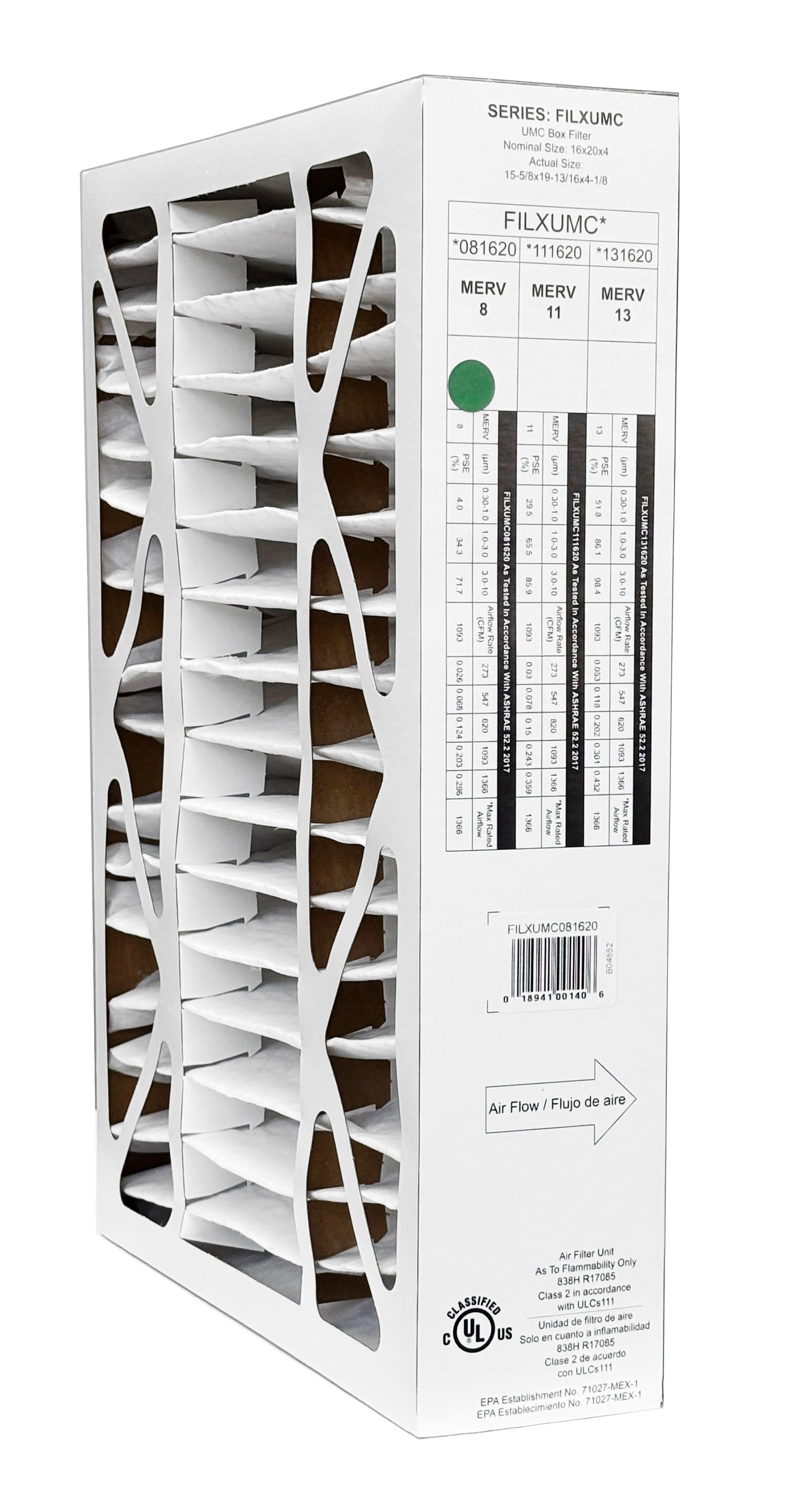 Carrier & Bryant FILXUMC081620 - 16" x 20" x 4" Pleated Air Filter, MERV 8 replaces old part # FILXXFNC0017